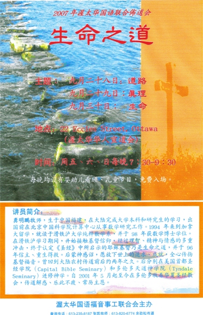 佈道會地點: 渥太華華人宣道會 (22 Eccles St., 位於中國城)