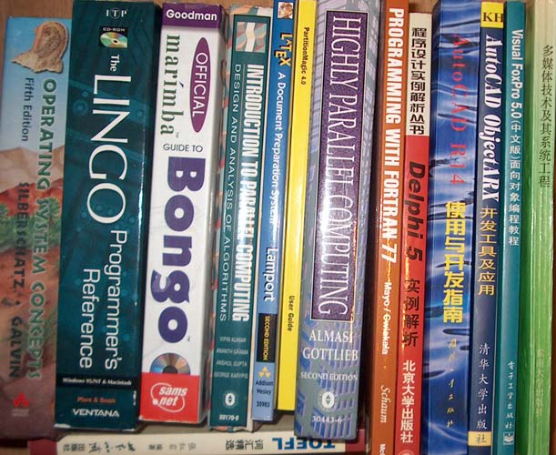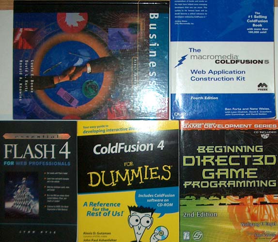 M Marcpo 新手上路 注册 2006-07-31 消息 242 荣誉分数 0 声望点数 0 2007-10-01 #3 1。Business教材, Web, ColdFusion, Flash, 和Game设计的专业书,都是经典的。 很多全新的。 附件 1book-web.jpg 90.1 KB · 查看: 938