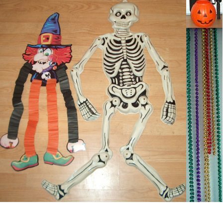 8。鬼节 / 圣诞节用品 1。左边两个是新添的,Halloween鬼节道具,妖怪的胳膊腿能伸缩晃动,骷髅的胳膊腿关节能活动,做起动作来张牙舞爪的,很funny。$4两个都拿走。 2。右边,下面的珠串,鬼节,圣诞节都能用,既可做服饰,也可挂在圣诞树或其他地方作装饰,很长很闪亮。都是全新的,$1两大串。 3。右边,上面是鬼节用的,可以提着它去要糖果,或是挂在家门口,单买$1.5 (SOLD)