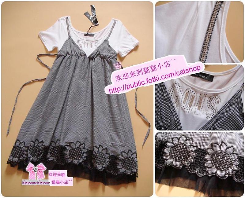 细格子下摆镂空花朵纱衬甜美假意2件式连衣裙
