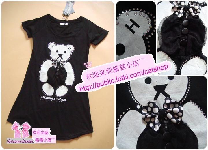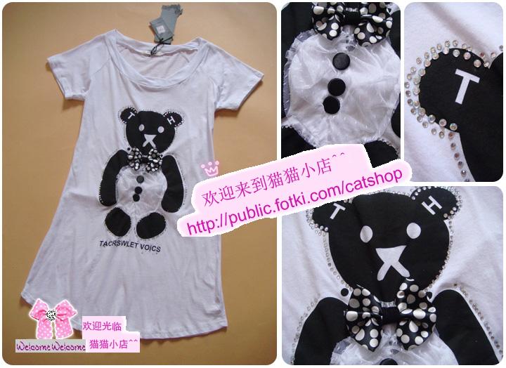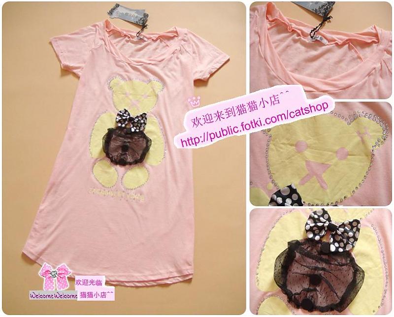 烫钻蕾丝蝴蝶结小熊可爱薄棉长款T