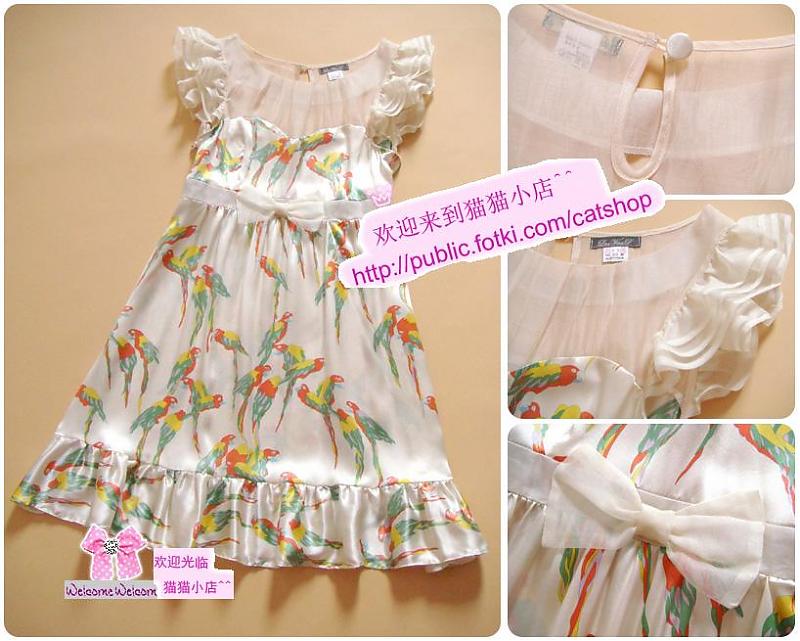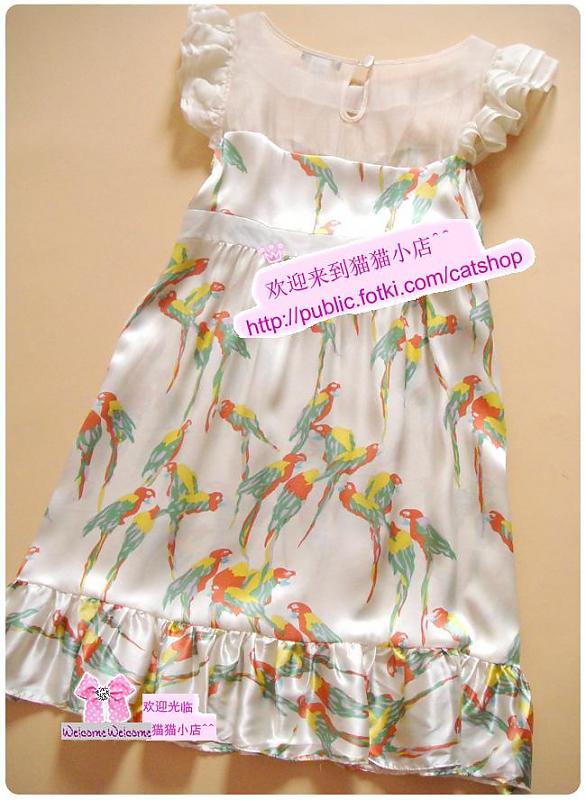 出口韩单,优质真丝质地、胸口的蝴蝶结、可爱的鹦鹉和荷叶边下摆装饰让整件衣服生动起来