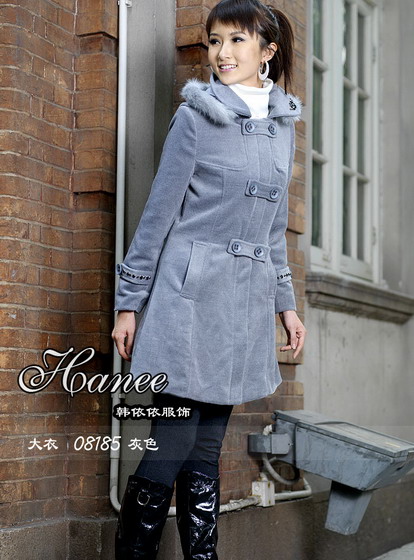 73.正品"Hanee"双排扣绵羊绒大衣( 毛边是真狐狸毛)(暂时缺货) 货号:Hanee8185 尺寸:分ML码.衣长M56CM L58CM胸围M92CM L96CM袖长59-60CM 面料:绵羊绒,狐狸毛边 预定价:$55 灰色