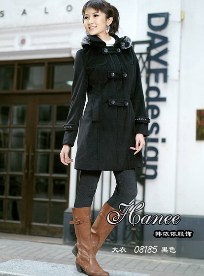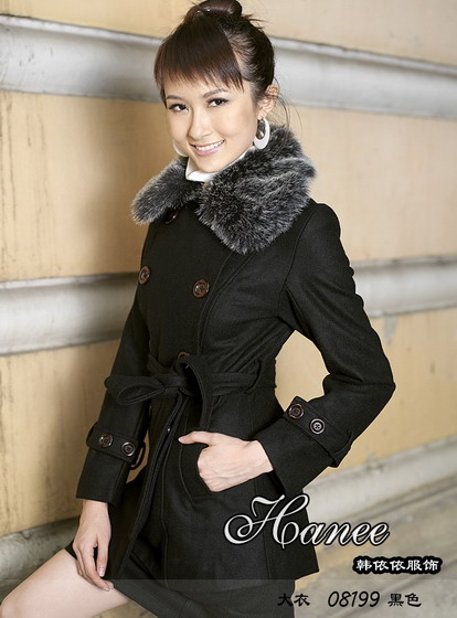 74.正品"Hanee"毛领中长修身呢子外套( 毛领可取, 领口可翻下来也可完全扣严,很修身的一款厚外套) 货号:Hanee8199 尺寸:分ML码.衣长M72CM L74CM 胸围M90CM L94CM袖长60-61CM 面料:麦呢 预定价:$50 黑色