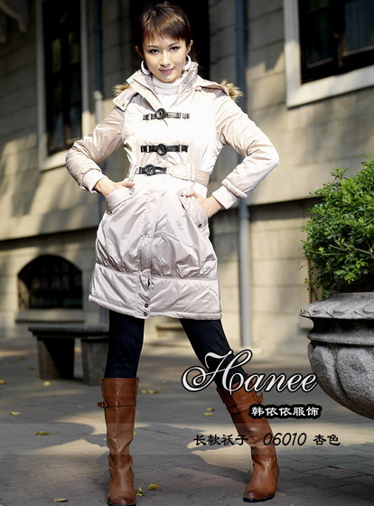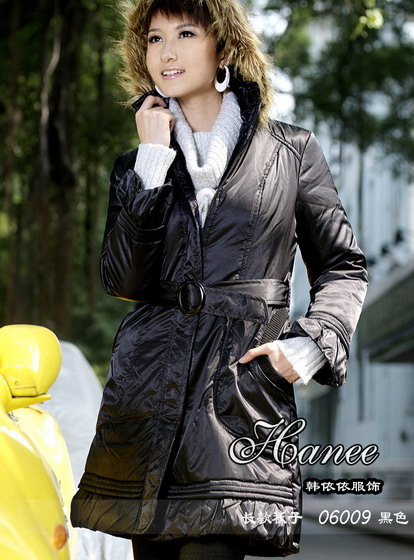 78.正品"Hanee"喇叭袖口收腰中长棉服( 帽子可取) 货号:Hanee06009 尺寸:分MLXL 码.衣长M90CM L92CM XL94CM胸围M84CM L88CM XL92CM袖长58-60CM 面料:锦棉 预定价:$48 黑色