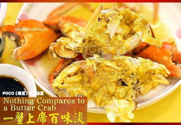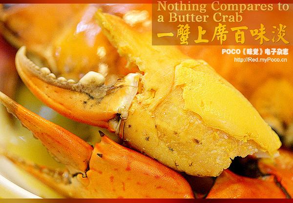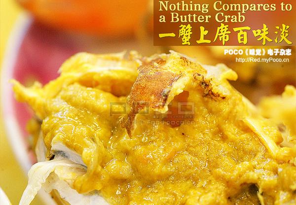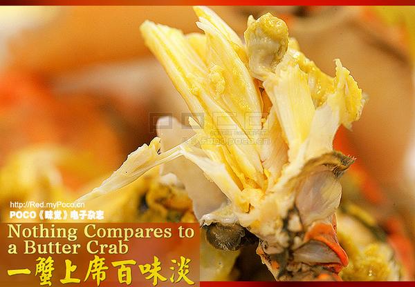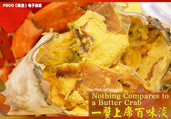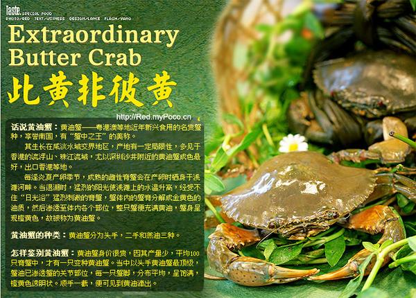 黄油蟹——粤港澳等地近年新兴食用的名贵蟹种,享誉南国,有“蟹中之王”的美称。其生长在咸淡水域交界地区,产地有一定局限性,多见于香港的流浮山、珠江流域,尤以深圳沙井附近的黄油蟹成色最好,出口香港等地。每逢炎夏产卵季节,成熟的雌性膏蟹会在产卵时栖身于浅滩河畔。当退潮时,猛烈的阳光使浅滩上的水温升高,经受不住“日光浴”猛烈刺激的膏蟹,蟹体内的蟹膏分解成金黄色的油质,然后渗透至体内各个部位,整只蟹便充满黄油,蟹身呈现橙黄色,故被称为黄油蟹。