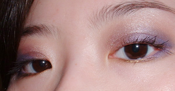 lemon aid全眼打底,我这里没有买UDPP的,XMAS去多伦多再买,所以一直用lemon aid,只用了不到半年,就已经见底了,我坚持天天用。lancome的filigree全眼扫光泽,MAC的parfait amour从内眼角扫至一半(双眼皮折范围),MAC的06圣诞盘里的蓝色从一半扫至外眼角,日本flora的金棕色过渡紫色到蓝色。clinique白色眉骨提亮。