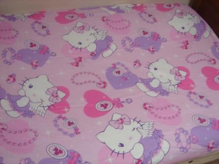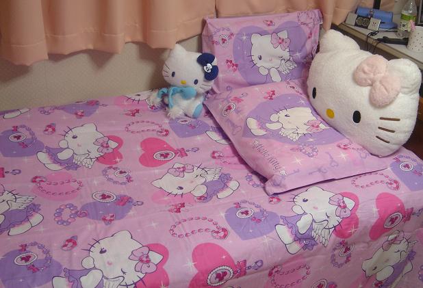 下面Hellokitty的一套是偶自己订的,总共四件,两个枕套,一个单人床套,还有一个双人床大小的床单,超可爱,质量就不用多说咯~