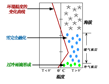 冰雨出现时地面往往不太寒冷(0℃-3℃),上空为逆稳,有一层温度高于0℃ 的暖层。