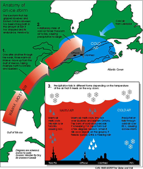 Freezing Rain occurs when snowflakes descend into a warmer layer of air and melt completely. When these liquid water drops fall through another thin layer of freezing air just above the surface, they don't have enough time to refreeze before reaching the ground. Because they are "supercooled," they instantly refreeze upon contact with anything that that is at or below O degrees C, creating a glaze of ice on the ground, trees, power lines, or other objects. A significant accumulation of freezing rain lasting several hours or more is called an ice storm.