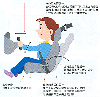 调整座椅的前后位置和方向盘的位置,可以使驾驶者视野良好同时便于操作。正确的驾驶姿势不仅可以使操作顺畅,还可以防止事故的发生,一旦发生事故也可以把危害降到最小限度。