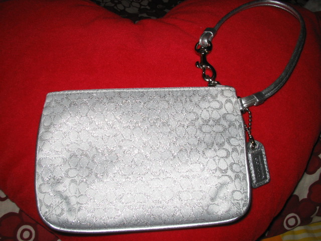 Coach mini pochette $50 银色闪光布的,很漂亮,可以当宴会包,也可以放些零钱,卡。 全新,绝对真品。Coach也不是很昂贵,没必要仿了。boxing day那天刚买的,一次没有用过。回来发现自己很少用这种小包包。当时觉得漂亮就买了。现在转给喜欢的MM吧。有兴趣悄悄话联系。