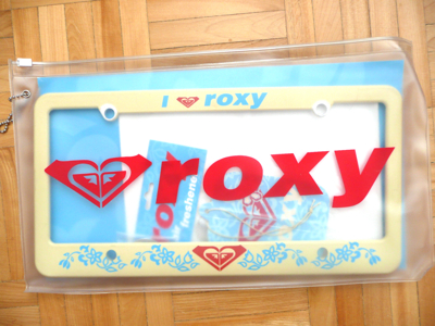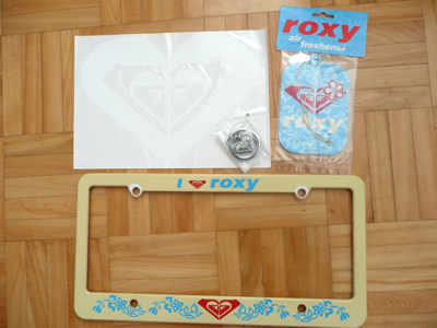 roxy "Road Trip Kit", includes: key chain, air fresher, sticker, license plate frame.