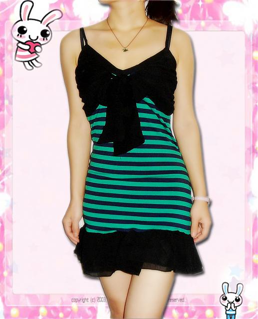 條紋設計.胸前有大蝴蝶結.穿起來超美,YY是出口日本的大牌子哦,做工精细,肩带可以调节长度,裙摆 是雪纺的材料,今年最最流行的小群摆设,甜美又不失性感