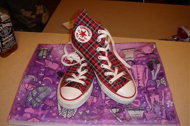 红色格纹的convers 是和白色一起寄来的. 适合38 号, 卖$10, 很新.