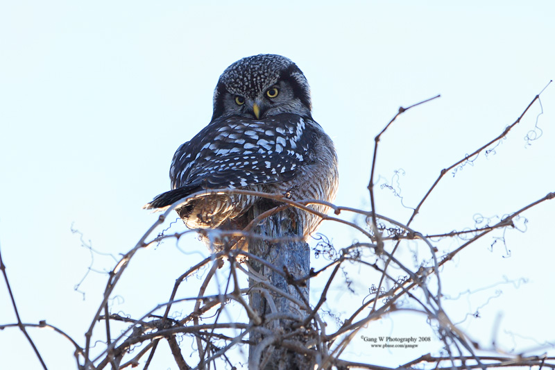 GangW 说: 2009 的冬天来了, 日子真难过,找食咋就这么难呢? 2008 12 08 morning, -21C Northern Hawk Owl, Gatineau, Quebec. 点击展开... 您终于找到它了!赞!
