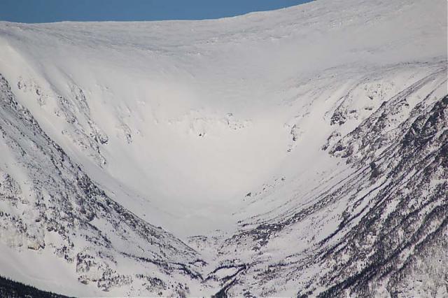 到了谷底,眼前的景象让我吃了一 惊。如果说我印象中的谷底是一个足球场的话,那么眼前的谷底是四个拼在一起的足球场!可见今年的积雪有多深。谷底的坡度放到任何一个商业雪场都是蓝道的难 度。狂风在巨大而宽阔的足球场上尽情肆孽,将谷底的浮雪吹得一片不剩,只剩下冰面,也吹得人感觉似纸片般轻薄。山谷中能见度很低,几百英尺高处那块吸引众 多高手一跃而下的巨石只有一点轮廓。见左翼的下方有块巨石,我们赶紧靠了过去。巨石旁被风蚀出的雪沟有两人多深。我们坐在巨石旁稍事休息。我的水瓶是彻底 被冻住,再也拧不开了。有人的水瓶失手掉落,我们眼睁睁看着它被风裹着顺着谷底一路就这样滚了下去。尽管我们是一群坚定的环保分子,垃圾带进带出是我们一 贯的方针,但这一次这个方针实在执行不了。