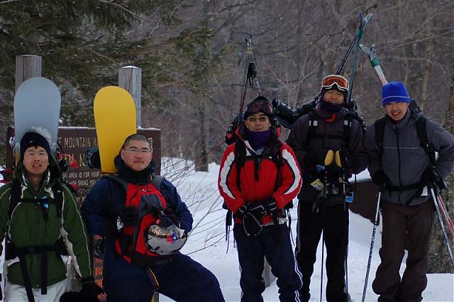 对于怎么下去,从一上来我们就开始讨论。我们有两个选择,一 是原路返回,走下去;二是从谷底滑雪下去。从谷底有一条滑雪道,Little Headwall,可以滑到庇护所,我们上来时也确实看到有人滑下去了。但是我们中间没有人滑过,对它的难度,风险不明了。只知道它今天的雪崩风险不大, 是中级。原路返回的风险就是那块硬冰,但我们有两副冰爪,还有一根扁带,安全还是有保障的,尽管场面可能会难看一点。在征求了一番意见之后,最后决定原路 走下去。但出谷底这一段还是可以滑的。从冰面滑到谷底的出口,我正准备脱雪橇,忽然看见下面的山沟里有几个人踩着雪橇正在树林里往上爬。他们能踩着雪板爬 上来,难道我们不能滑下去?于是又重新集合,布置好前锋后队,往山沟里闯。大自然是神奇的,也是公平的。在爬山,攀冰,风吹和滑冰等种种磨难之后,大自然 给我们预备的是天然粉雪,而且还奇厚无比。估计这一场暴风雪给这一片山谷带来的浮雪都被吹这条山沟里来了。雪不但把岩石灌木给盖住了,还把悬崖也裹住了。 路上经过的两处让人胆颤心惊的大悬崖,给我们带来的是轻松而又愉快的记忆。