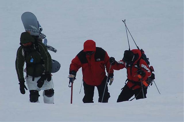 从庇护所到谷底是从有树带到无树带过渡的地段。穿出一小片树林之后,我们开始爬石头路。没有了大树的遮 挡,我们开始感觉到了风的威力。脚下不再是松软的雪,取而代之的是冰壳,要用靴子敲出坑来才能往上爬。一阵大风吹过,就有摇摇欲坠的感觉。手脚并用爬过了 这一段冰壳,接下来的路面是玻璃一样的硬冰,用靴子都敲不出坑来。有一些石块突出冰面,但也是盖着一层冰。Tony在前面开路,他利用突出的石块开始攀 爬,壁虎游墙一般在冰面上辗转。眼看就了到安全地带了,却再也找不到下一块承重的石头,几经尝试,最后整个人趴在了冰面上,欲上不能,欲下不得。我在他下 方二三米的地方,也在冰面上,Justin在我下面,还没开始爬,他身后还有两个同伴正在穿冰爪,而前面的三个人没有冰爪。我先靠边挪了挪,拉着山边的树 根站稳了脚。我估量了一番形势。坡的下方是一些低矮的松树,细而且密,完全可以拦住一个人。如果Tony失手滑下来,在我的阻滞之下,他落在树丛里应无大 碍。心安之后我开始考虑救援。正当我在犹豫是我上去,还是等有冰爪的同伴上来之时,上面下来了一队穿着冰爪的登山的人。走在前面的一位女队员伸手将 Tony拉了起来,扶他到了安全地带。让过这一队人,我借着树根和树枝绕到冰面的上方,再横切到了安全地带。Justin更强,硬闯了几步,看形势不对, 问同伴要过雪铲,敲掉一块块石头上的冰,一步一个脚印稳稳当当走了上来。其沉着冷静的心理素质让人惊讶。