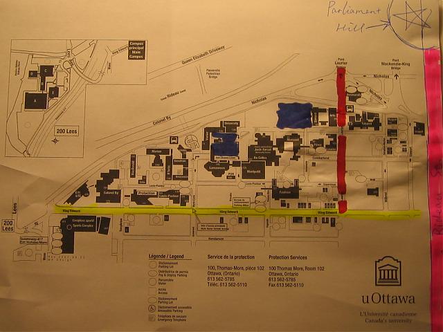 制作有些粗糙,希望大家能看明白。 国会山附近几条街很难有停车位,但OU校区应该会有很多车位。 地图右侧是北向。 后手边粉红色街道是Rideau St. 五角星(右上角)是活动地点Parliament Hill. 红线道路是Laurier, 大多数人会从这个方向进入校区,两块蓝色区域是停车场,但要收费。 校区里路边一般都可以免费停车,周日没有时间限制。黄色路线(King Edward)以东(地图上黄线下方部分) 的街道都可以随便停车, 距离国会山大约10分钟左右步程。