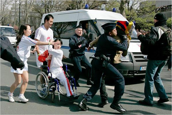 我在艾菲尔铁塔出来后的那段塞纳河边,火炬手是个一条腿被截肢的年轻的姑娘,另还有一男和一女保护,几乎隔5秒就冲出一个人试图去抢火炬,前进的道路异常艰难,于是为了保护这位姑娘,那一男和一女就将轮椅暂且推到了路边停放的两辆汽车中间的辖道缝隙避一避,正在我的面前。此时从路边突然冲出一个暴徒去抢火炬,而保护她的一男一女因汽车挡着无法近身,勇敢的姑娘低下头让出自己的背保护火炬,暴徒就拉扯她的胳膊还打她,那一刻我脑子里啥都没有,本能的冲上去拉拽那个暴徒,用手里的相机打他。随后我左边又有一个人冲过来打那个暴徒(还好不是打我的),还有一个法国警察过来最终把暴徒揪走了。这一切都只发生在瞬间!火炬手姑娘重新抬起头,大眼睛中含着泪水,我左边的一个中国女生向她高喊:加油,要坚强!我才缓过神来,也喊到:加油,加油!此时我的眼泪才唰的一下下来,我很悲愤,一个手无寸铁的女生,更何况是个残疾人,也要打?起码的人道主义都没有。政治运动中,永远有一些暴徒打着民主与自由的旗帜进行暴力行动。