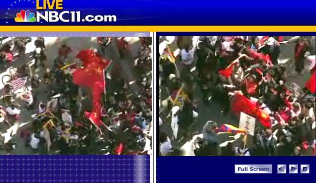 旧金山当地时间4月9日上午10点,北京时间4月10日凌晨2点,当“藏独”分子在4500多名华人面前再次跨过护栏冲进跑道时,现场的华人都愤怒了。他 们挥舞着五星红旗大声呼喊着“北京奥运必胜!” 甚至当“藏独”分子冲进场内的时候,一名举着五星红旗的年轻女孩也愤怒的冲进场内,要将破坏者拉出去。而美国警方也迅速的将这名“藏独”分子驱逐出传递内 场。