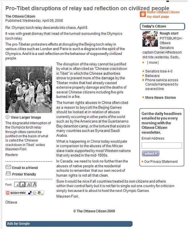 番茄炒西红柿 说: 公道自在人心, 终于见到了西方要求正视藏独问题的呼声 全文如下: 点击展开... I was not able to find this on the Ottawa Citizen Web site last evening. Wondering if it was removed.