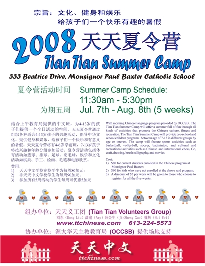 天天夏令营从七月七日开始,到八月八日结束,为期五周。营员可以在参加了早上的教育局的中文班之后,原地继续参加天天夏令营的活动。夏令营活动时间为上午11:30 到下午5:30。天天夏令营地点在333 Beatrice Drive, Monsignor Paul Baxter Catholic School, 即现在天天中文学校所在校址。