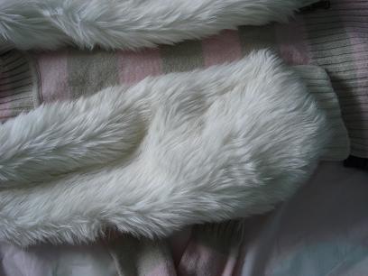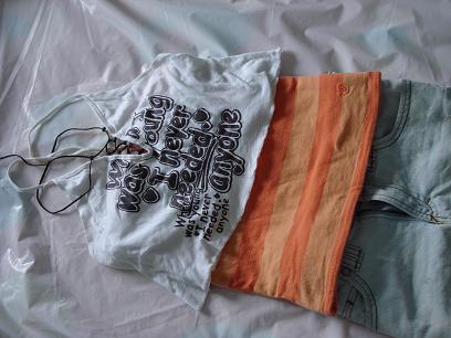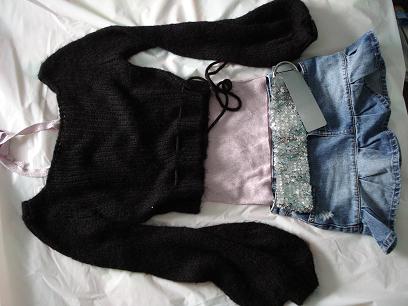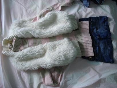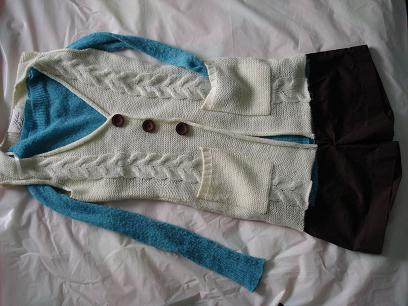 白色毛织马甲 10刀 --> 8 bucks now small & medium fit 蓝色毛衣 5刀 small -> 4 bucks now 棕色短裤 12刀 small --> 10 bucks now
