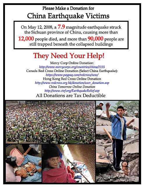 灾区人民的安危,牵动着广大海外华人的关爱之心。5月15日下午1点至4点,渥太华大学中国同学会将在University Center Club Room 设立捐款点,方便所有希望为灾区人民捐赠的朋友们。捐款截止日期视情况另行通知。学联募捐经大使馆授权,一切募捐学联将会提供相关收据和记录表格,所有募捐善款将通过大使馆转交国内慈善机构。
