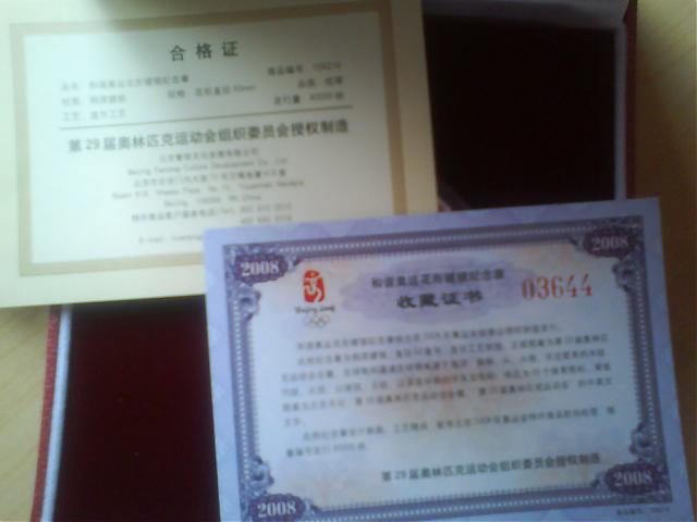 血色空间 新手上路 注册 2004-12-09 消息 337 荣誉分数 5 声望点数 0 2008-05-21 #1 和谐奥运花型纪念章经北京2008年奥运会组委会授全制造发行。 正面图案为第29届奥林匹克运动会会徽、吉祥物,底纹图案为蕴含着与吉祥物来源于江河湖海、森林、圣火、山川大地、天空联系的水纹、竹纹、火纹、山坡纹、云纹图案;背面为第29届奥林匹克运动会会徽和中英文文字,以及花形图案。 包装精美 现有2枚。。降价拉~ $40 有兴趣的请发QQH。 因为是用手机照的,所以图片有些不清楚 >.< 谢谢:blowzy: 附件 DSC00076.jpg 27.2 KB · 查看: 174