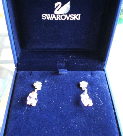 这幅耳环是别人送我的, 因为不是自己喜欢的款式,所以放家里一年都没有带过。 与其放在家里休眠, 不如买给喜欢它的MM. 这个款式现在已经绝版了,上面是一个湖蓝色的小花, 坠子是一个水晶蝴蝶和淡粉色的水晶花朵。(有SWAROVSKI CERTIFICATE).