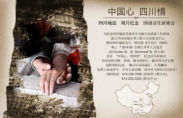 为纪念四川地震受害者,并为救灾及重建工作祈祷, 渥太华国语福音事工联合会及恩光中心将于四川地震发生一周月的612(周四) 晚上7:309:30在渥太华华人宣道会 (22 Eccles St., Somerset St. 唐人街) 举办 中国心,四川情纪念音乐祈祷会,内容包括诗歌,祈祷,救灾投影片,献诗及关于安慰及盼望的信息。晚会以国语进行,不设翻译,免费入场及停车,并有儿童看顾,请齐来为四川灾民祈求!