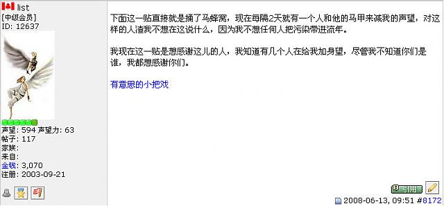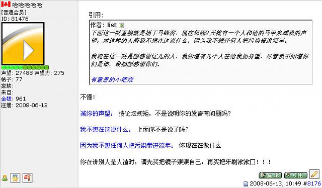 有人专门跑到别的论坛去排队加身望把自己的身望先抬高到好几万,然后到这个论坛来破口大骂,再减和他意见相反人的身望,这样的上窜下跳在一般人看来很搞笑,但还就有人乐此不彼,好玩:D