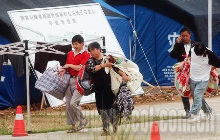这条可以回家的消息,顿时在山上炸开了锅。有的喊着孩子的名字,有的忙着收捡物品,现场一片忙乱。王军更是来不及细细打整,将被子、床单和枕头等一股脑 儿地堆在三轮车上,迫不及待往家赶。母亲收拾着其余物品,紧跟其后。家住沈家坝东街的老唐更着急,他直接将一个折叠式床和妻子从帐篷中抬了出来,两人横着 在路上嘻笑着回家。