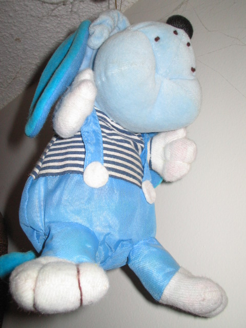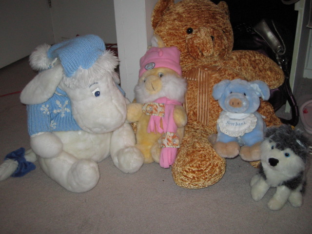 各类公仔: 迪斯尼小驴 $5 (sold) 大熊宝宝 $5 (sold) 粉帽子帽子小兔 $2 (sold) 蓝色小猪 $2 (sold) 灰白小狗 $1 小猴 $1 蓝色小狗 $1 大红中国结 $5, 两个$8 墙上工艺品 $2