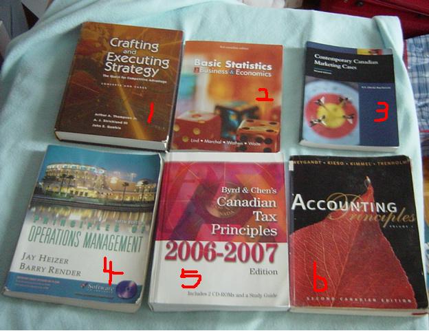 Algonquin的课本...因为毕业1年了,都不记得是哪些课的了>.< 1----$ 30 2----$ 28 3----$ 10 4----$ 25 5----$ 70 6----$ 8 一手书主~ 都挺新的