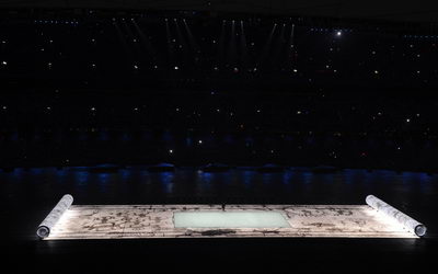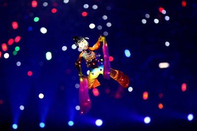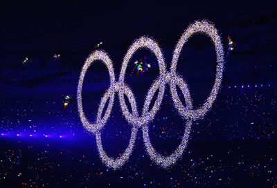 此刻的鸟巢繁星点点,尤如浩瀚的星河落入人间。美丽的飞天在繁星中歌舞,唯美浪漫,如梦如幻,为奥运五环增添一抹中国色彩,为奥运五环烙印一段 中国的记忆,也像美丽的梦幻在中国人心中憧憬百年。一个由星光组成的奥运五环散发着璀璨的光芒,美丽的飞天把闪光的五环托起在北京的夜空,点亮了北京的夜 色,点亮了每个热爱和平、热爱友谊、热爱奥林匹克运动的人心中跃动的激情。这个璀璨的五环会让我们记住北京的星空里终于有了奥运五环的印迹,更会让全世界 都记住,奥运会的记忆中从此有了中国的传奇。