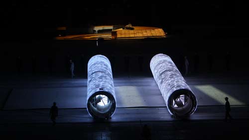 主持人:一道耀眼的光环,激活了古老的日晷。独特的多媒体手段,拉开了开幕式的帷幕。日晷将光反射到场地的缶上。缶是中国古老的打击乐器,由陶土或青铜制成。早在夏、商时代,就有了击缶而歌的演奏。此刻它们正以光的律动向我们传递光阴的概念。