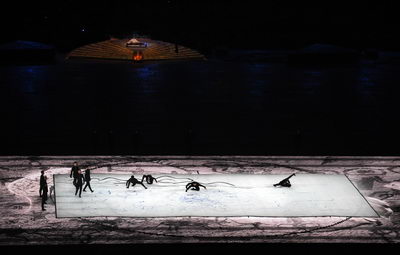 近代的船桨把我们的思绪从风情多样的内 陆带到了一望无际的海上,船桨连接,呈现出中国古老的航海形象,海上丝绸之路是古代中国与外国交通贸易和文化交往的海上通道。体育场的上方此时已是波浪汹 涌,场中的长幅画卷上也已经海浪滔天,船桨滑落,桨手们在波浪中搏斗,体现了中国人挑战自然的勇气与智慧。