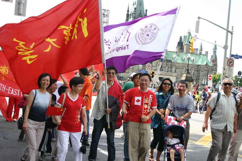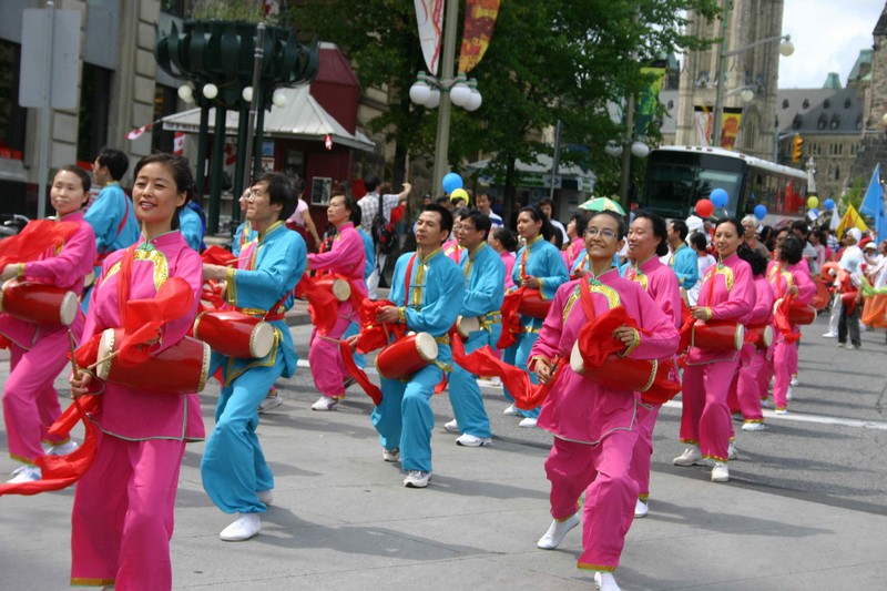 演出結束後,集會活動進入了高潮——進行從國會山到渥太華市政府約2公里遊行。隨著主持人一聲令下,與會者很快完成了隊形轉換,護旗手變前陣,觀眾則編成十余個方陣跟進。渥太華警方特派出兩輛摩托車開道,並在沿途實施了交通管制。一時間,彩旗飛揚,鑼鼓齊鳴,歡樂的人流取代了嘈雜的車流。