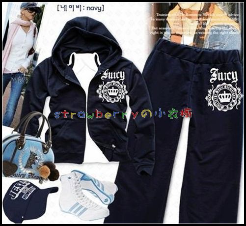 JUICY徽章套装 $26.00 颜色:宝蓝色面料:棉 尺码: (上)肩宽39 胸围90 袖长56 衣长54 (下)腰围64 臀围92 档高29 裤长95 此运动套装整体效果为淑女高雅型,面料为棉质,所以不是容易贴身。衣服薄厚度为中间值,适合春末秋初穿着。