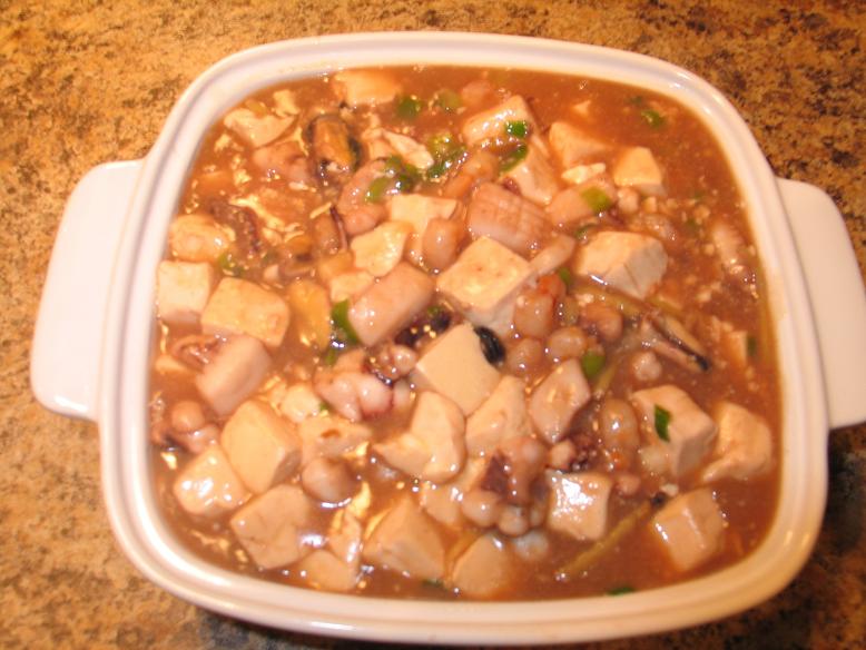 2.再往炒锅里加一点点清油,放蒜沫,炒两下后加豆腐,轻轻翻几下,同时加酱油,糖,鸡精,轻轻翻炒,使加入的调料均匀,然后把海鲜倒回锅里,用中火煲3分钟,之后把火调大,勾芡,加葱沫就好了