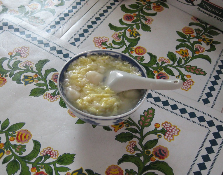 用水调糯米粉,搓成小圆团子扔入锅中,