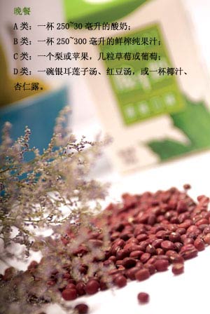 选择提示:尽量选择一些奶制品和水果作为自己的晚餐,但要控制在少量,以确保胃的排空,有益瑜伽的练习。