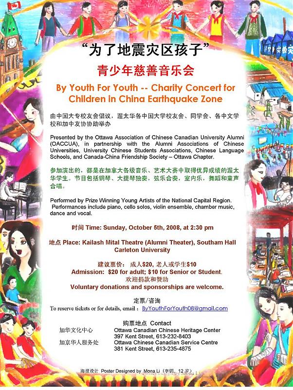 为了筹办“为了灾区孩子” 慈善音乐会,组委会动员了首都地区极具艺术天赋的青少年学生,其中包括邀请12岁的李玥(Mona Li)同学为慈善音乐会设计海报。Mona的作品《我和福娃传圣火》在刚刚结束的加拿大第六届国际儿童艺术(绘画)展中获得金奖。