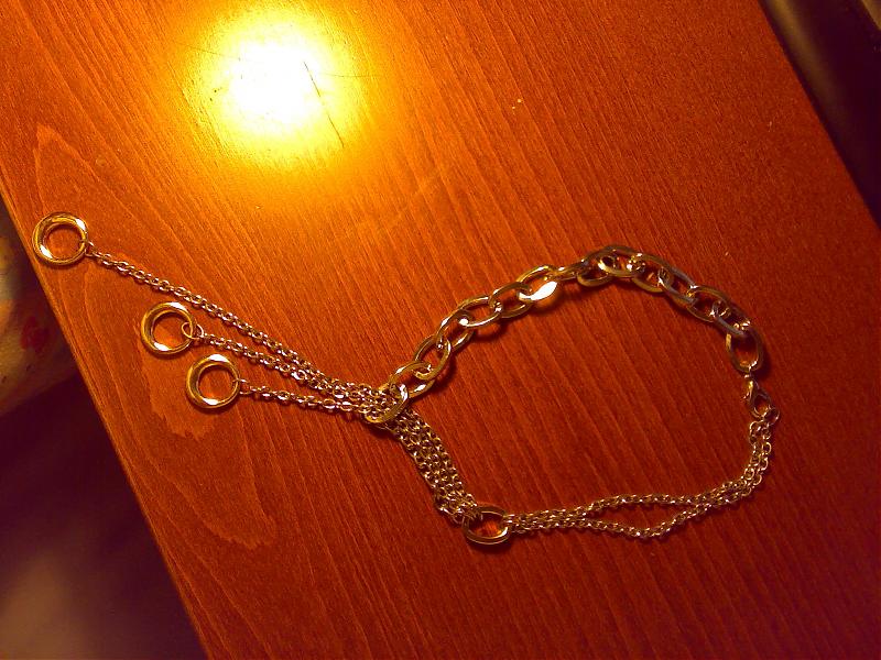 最后,是一件在这里买的项链一条,原价是25刀不加税,现在半价,这款项链其实很漂亮,下方的3圈吊坠是金色的,整体为银色,不对称的设计外加3条吊坠,戴起来显得很有气质很与众不同(我不太会形容~~~)mm们有兴趣可以来试戴