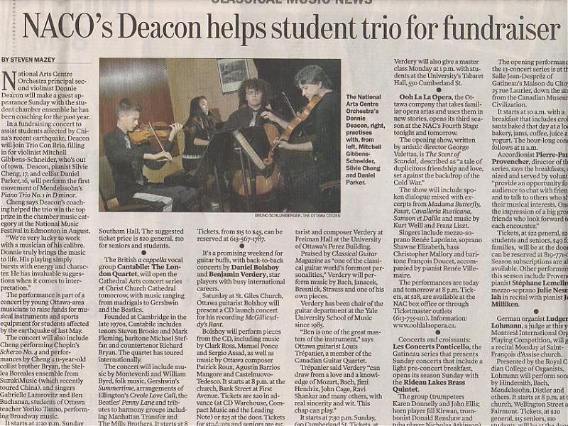 《渥太华公民报 The Ottawa Citizen》昨天(10月2日星期四)在艺术版(ARTS)古典音乐专栏(Classical Music News) 用通栏标题配照片报道这次华人社区主办的“为了地震灾区的孩子”青少年慈善义演。