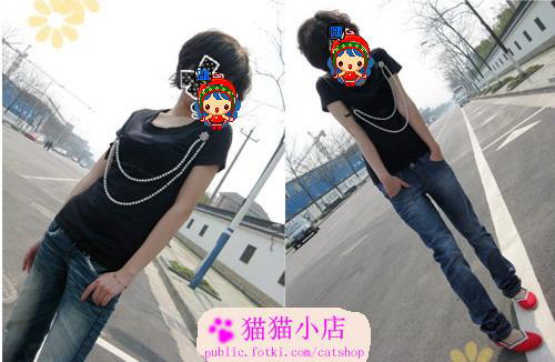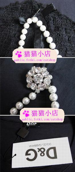 D&G 复古绣花.珍珠链装饰酷酷T $42 品牌:D&G 尺寸:肩36 胸78 长60 袖长14CM 质地:棉 颜色:黑色 备注:D&G的T不用我多说了,大牌的设计 胸口的链子可以拆卸,还有他的特色,大家看细节图拉 很有个性的一款T,有点女人又有点个性 要的就是这样的感觉