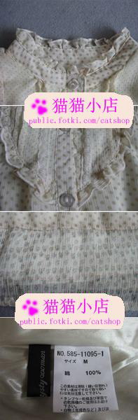 cat_emma 新手上路 注册 2005-12-05 消息 2,195 荣誉分数 4 声望点数 0 2009-03-15 #138 MYSTY 黄色点点木耳边立领短袖连衣裙 $48 品牌:MYSTY 尺寸:肩36 胸95 长77 袖长23CM 质地:雪纺 颜色:浅黄色 备注:又卷土重来的大爱雪纺,曾经一日销售过百件~~ 吼吼大家有福了哦,木耳边的设计是我们的大爱 相信大家也和我一样呢,呵呵还不快下手哦~ 袖口有扣子哦.一般来说扣起来都会有点紧哦.. 一般是选择不扣的哦~ 附件 10.jpg 36.2 KB · 查看: 38 10a.jpg 34.9 KB · 查看: 40 10b.jpg 40.4 KB · 查看: 39 10c.jpg 37.2 KB · 查看: 40